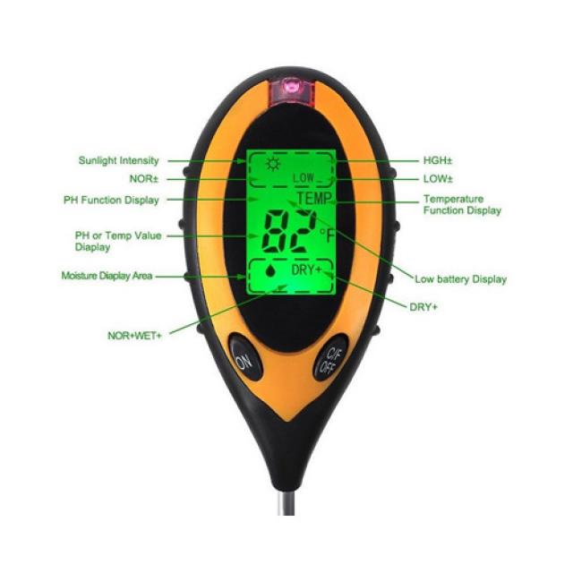 Simply insert the meter into the soil, switch to the setting you want to measure