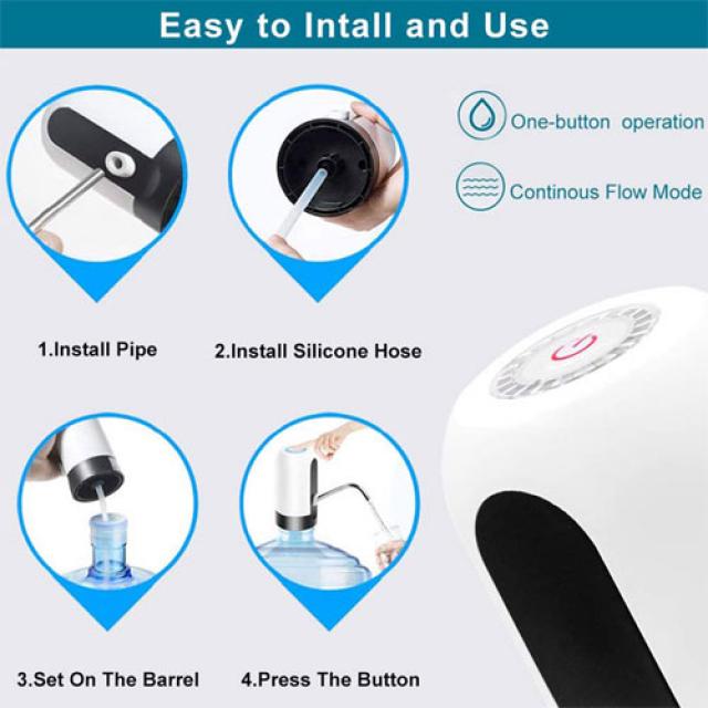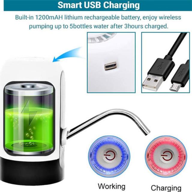 Universal electric drinking water pump designed for easy water dispensing. Just press the switch button and you can get the water quickly. Comes with USB cable for easy charging. The red indicator light will flash while it is charging, and it will normally on when full charged. Stainless steel outlet pipe provides a good angle for getting water. Food grade silicone hose is safe to use and detachable.