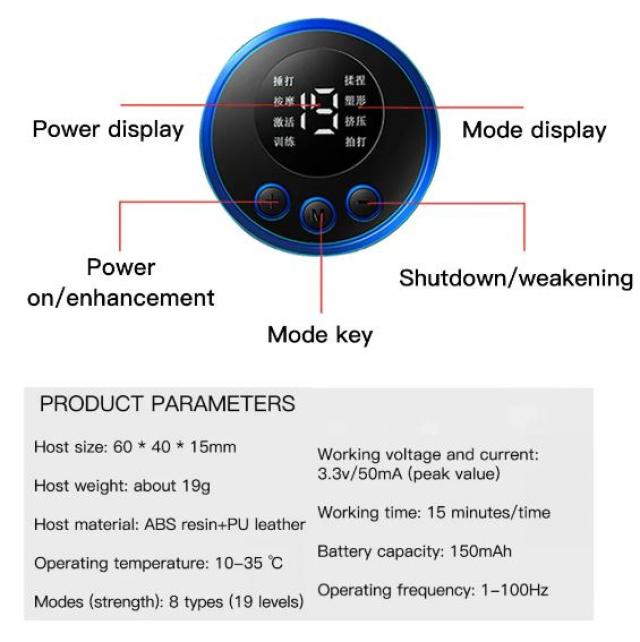 * 8 modes & 19 Levels: There are different intensity levels for each mode (Tapping, massage, massage, squeezing, tapping, kneading, training, shaping) Users can choose different intensities according individual needs.