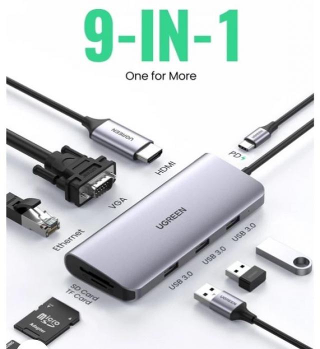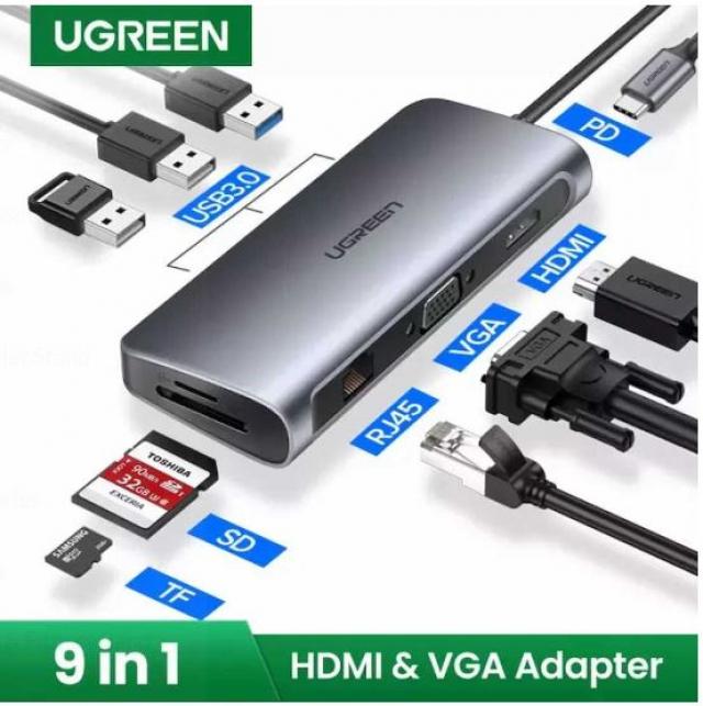 UGREEN 40873 9-in-1 USB-C PD to 4Kx2 K HDMI VGA RJ45 3x USB 3.0 SD TF Card