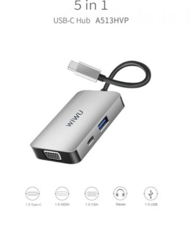 Wiwu Alpha 513HVP 5 in 1 Adapter USB Type-C To VGA, USB3.0, HDMI, 3.5mm Jack, PD Charge